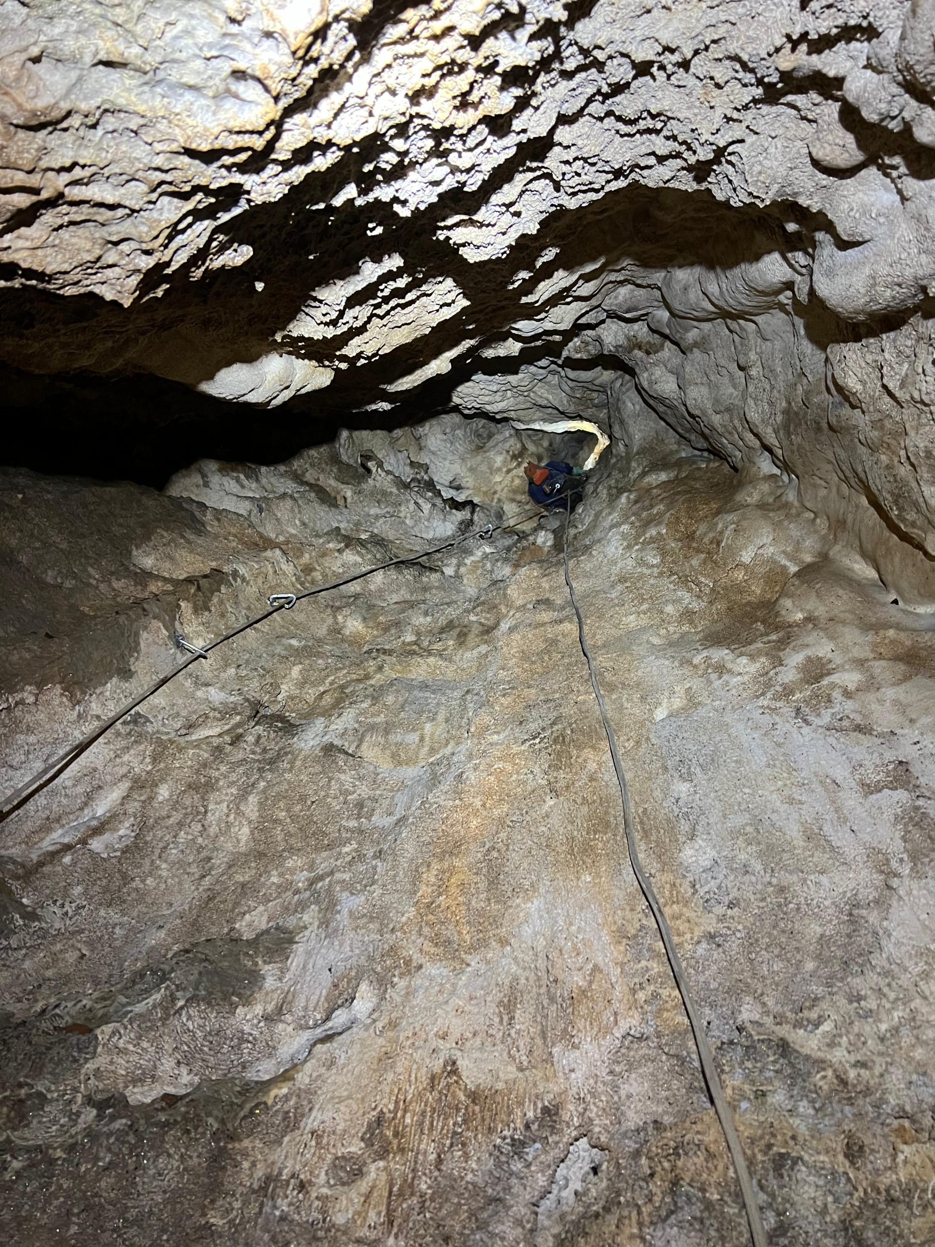 El equipo de topografia mide 28m en la entrada secundaria, luego 46m en la galeria de los topografos cansados, hasta que se cansan y 28m en el bucle posterior a la E5 de la entrada.